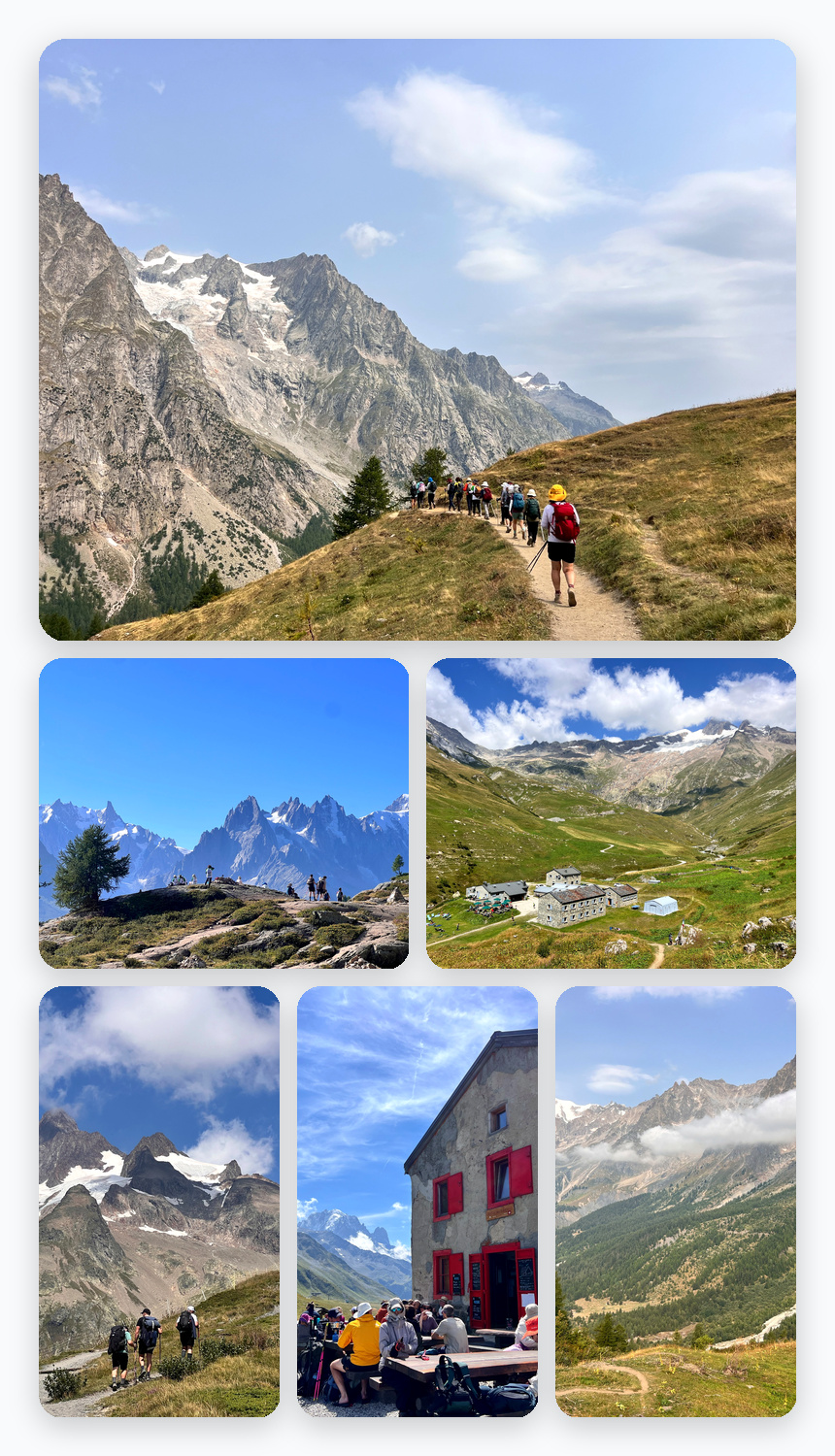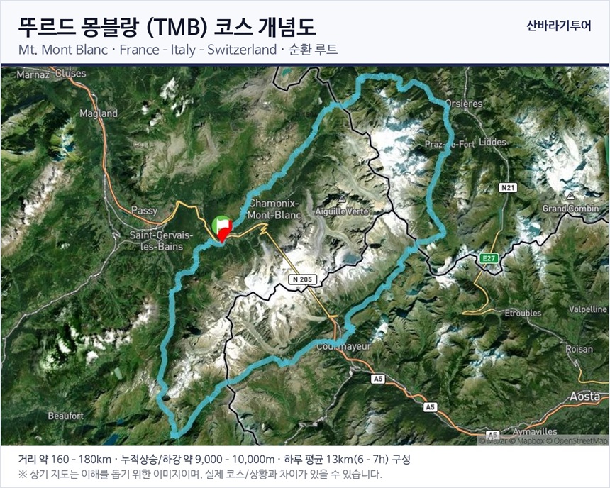 »êÀå Á¶½Ä ÈÄ TMB(¶Ñ¸£ µå ¸ùºí¶û, Tour du Mont Blanc) Æ®·¹Å· 7ÀÏÂ÷ ¿¤¸®ÀÚº£Å¸»êÀå(Rif Elisabetta, 2,195m) ~ Ä޹߽ÀÁö(Combal, 1,968m) ~ ÄÝ ¼ÎÅ©·çÀÌ(Col Checrouit, 1,956m) ~ ²Ù¸£¸¶À̾î(Courmayeur, 1,226m) ÀÌ ±¸°£Àº ÀÌÅ»¸®¾Æ ±¸°£ Áß¿¡¼µµ °¡Àå ¾Æ¸§´ä°í °¨µ¿ÀûÀÎ ÇÏÀ̶óÀÌÆ®·Î ²ÅÈü´Ï´Ù. ¸ùºí¶û ³²¸éÀÇ °Å´ëÇÑ ºùÇÏ¿Í ¼³»ê, ±×¸®°í ÀÌÅ»¸®¾Æ Äí¸£¸¶ÀÌ¿¡¸£(Courmayeur) ·Î À̾îÁö´Â ¾ËÇÁ½ºÀÇ º¯È¹«½ÖÇÑ Ç³°æÀÌ ¾Ð±ÇÀÔ´Ï´Ù. Æ®·¹Å· ³»³» ÆÄ³ë¶ó¸¶ Àü¸Á°ú ÀÚ¿¬ÀÇ Á¶È°¡ À̾îÁö¸ç, ÀÌ ¿©Á¤Àº ¡°¾ËÇÁ½ºÀÇ ¿¹¼úÀû ±¸°£¡±À̶ó ºÒ¸³´Ï´Ù. °Å¸®:16km / ¼Ò¿ä½Ã°£:6½Ã°£ / °íµµÂ÷: 243m¡é,467m¡è,1193¡é